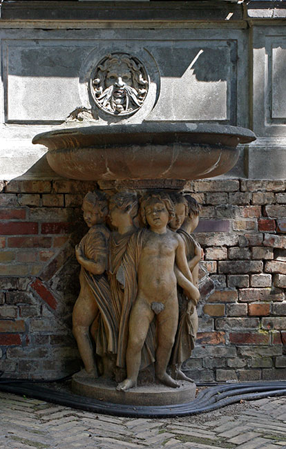 Ursprünglich floss das Wasser aus einer zwischen den Säulen stehenden Marmorschale in die von einer Kindergruppe aus Terrakotta getragene Zementschale.