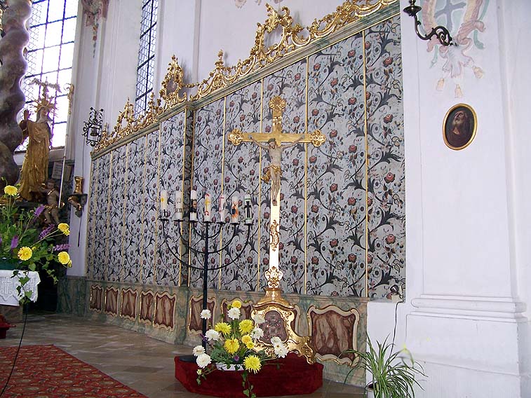 Handgearbeitete Leinwand-Tapeten an den Seitenwänden des Presbyteriums