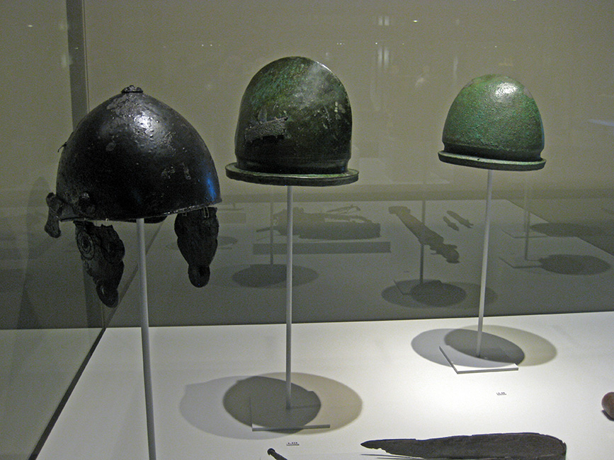 Rechts: Bronzehelm vom Typ Negau, 5. Jhd. v. Chr. Populonia, Prov. Livorno.
